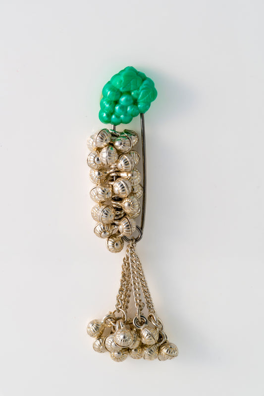 A unique brooch designed with cascading silver ghungroo beads, paired with a bold green floral accent at the top. The soft jingling sound of the ghungroos adds a touch of tradition, while the vibrant green detail makes it a standout accessory for sarees, dupattas, and festive outfits. Dimensions: Length 55mm...