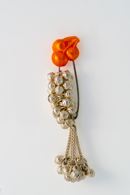 A charming brooch designed with cascading silver ghungroo beads and finished with a vibrant orange floral accent. The jingling ghungroos bring a festive touch, while the bold color detail makes it the perfect accessory for sarees, dupattas, and traditional wear. Dimensions: Length 55mm × Width 10mm Material: Pure Silver with...