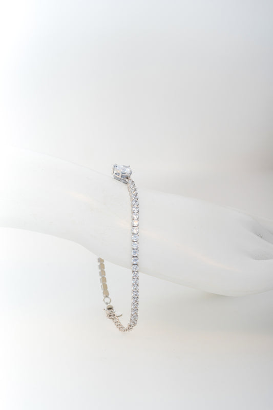 A classic tennis bracelet with a romantic twist — this elegant piece features a heart-shaped CZ stone at the center, surrounded by a continuous line of brilliant stones. Crafted in polished silver, it’s the perfect blend of timeless elegance and modern charm. Size: 8 Inch Design: Tennis bracelet with a...