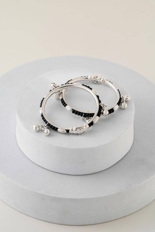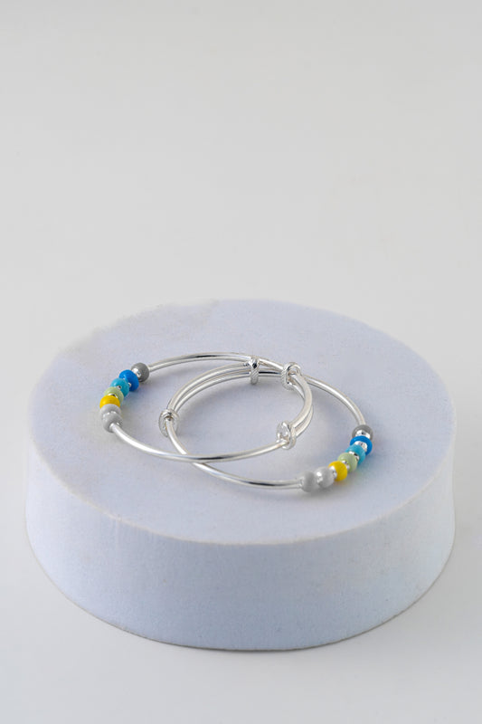 Add a playful charm to your everyday style with these handcrafted silver bangles, designed with multi-colored beads in yellow, blue, grey, and green. The free size adjustable fit makes them versatile – perfect for kids, women, or as a thoughtful gift for loved ones. Lightweight yet stylish, these bangles blend...