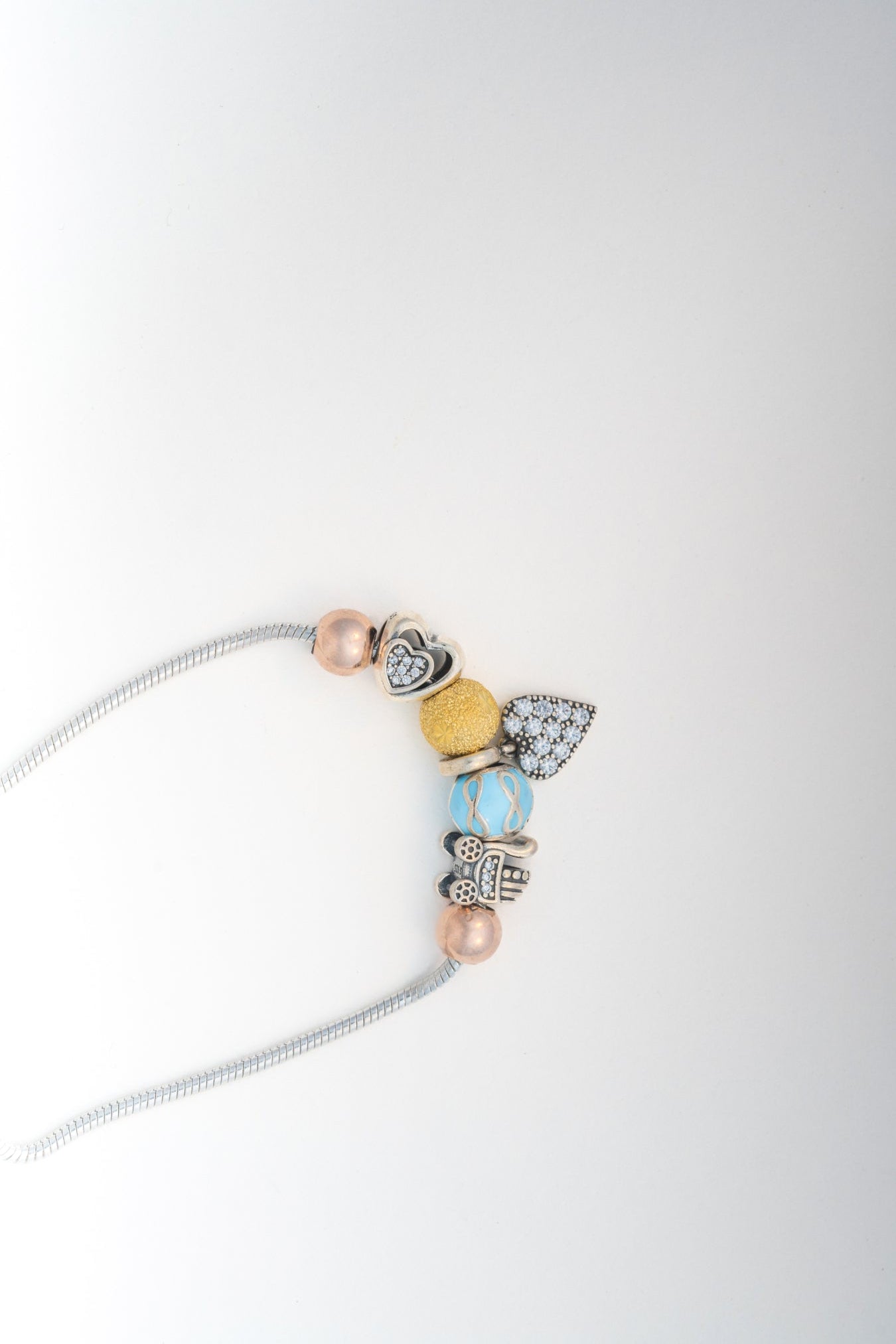 A delightful mix of charms, this bracelet brings playful elegance to your wrist. Featuring shimmering heart pendants, colorful beads in blue and gold, and antique-finish motifs, it’s a perfect balance of fun and sophistication. Designed on a flexible silver chain, this piece can be styled solo or layered for a personalized look.