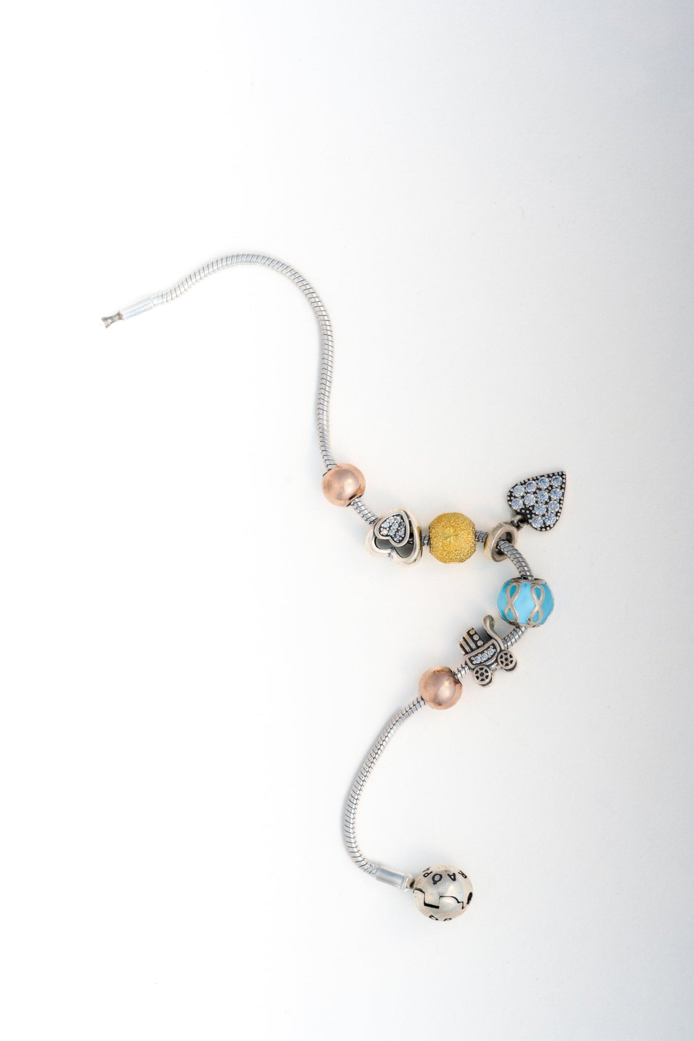 Design: Multi-charm bracelet with hearts, beads & motifs