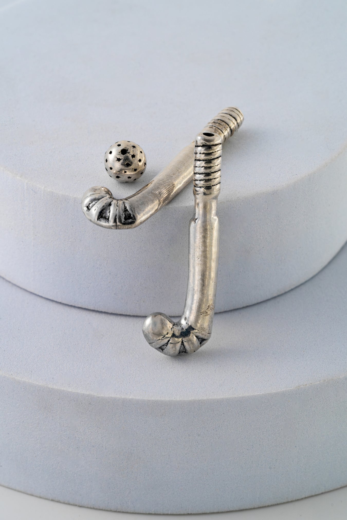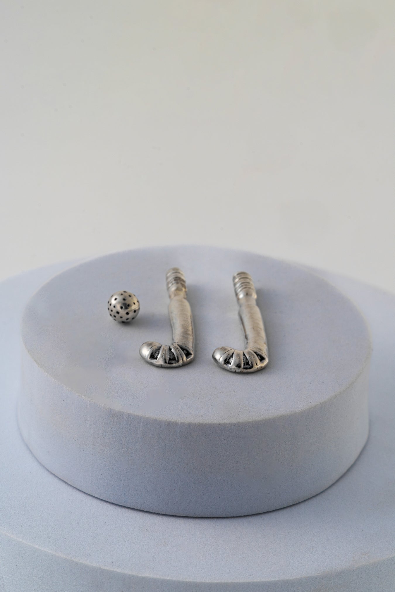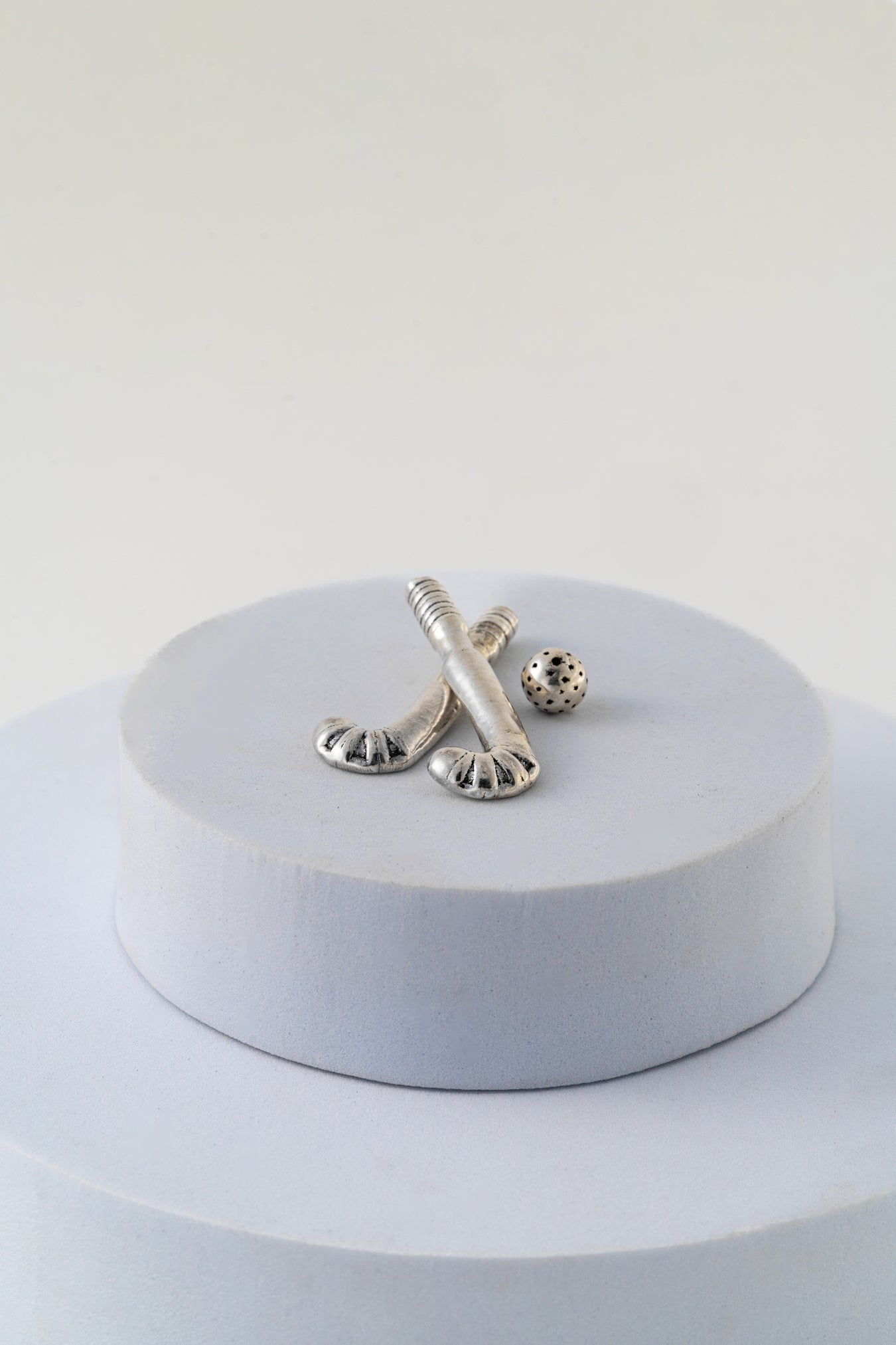 Celebrate the spirit of sports with this 2-inch handcrafted silver miniature hockey set, complete with crossed sticks and a detailed ball. Intricately carved with antique accents, this collectible is a unique keepsake for sports lovers and makes a thoughtful gift for hockey enthusiasts.