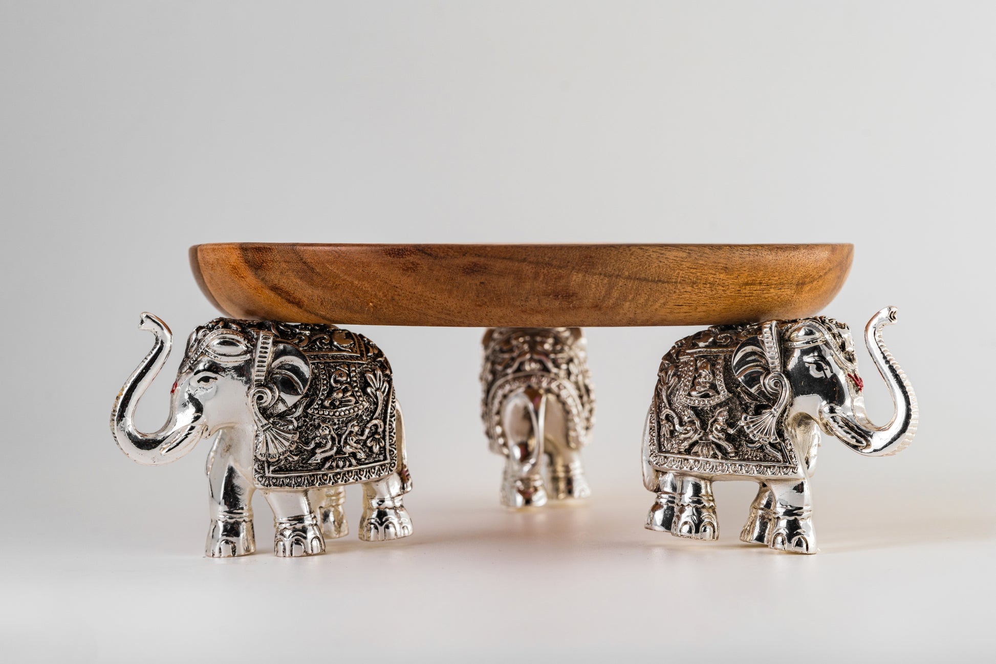 A beautifully handcrafted wooden platter supported by intricately detailed silver-foiled elephants. Symbolizing strength, wisdom, and prosperity, this elegant piece is perfect for serving, gifting, or as a decorative centerpiece in your home. The blend of rich wood and antique silver finish adds a royal touch to any setting.