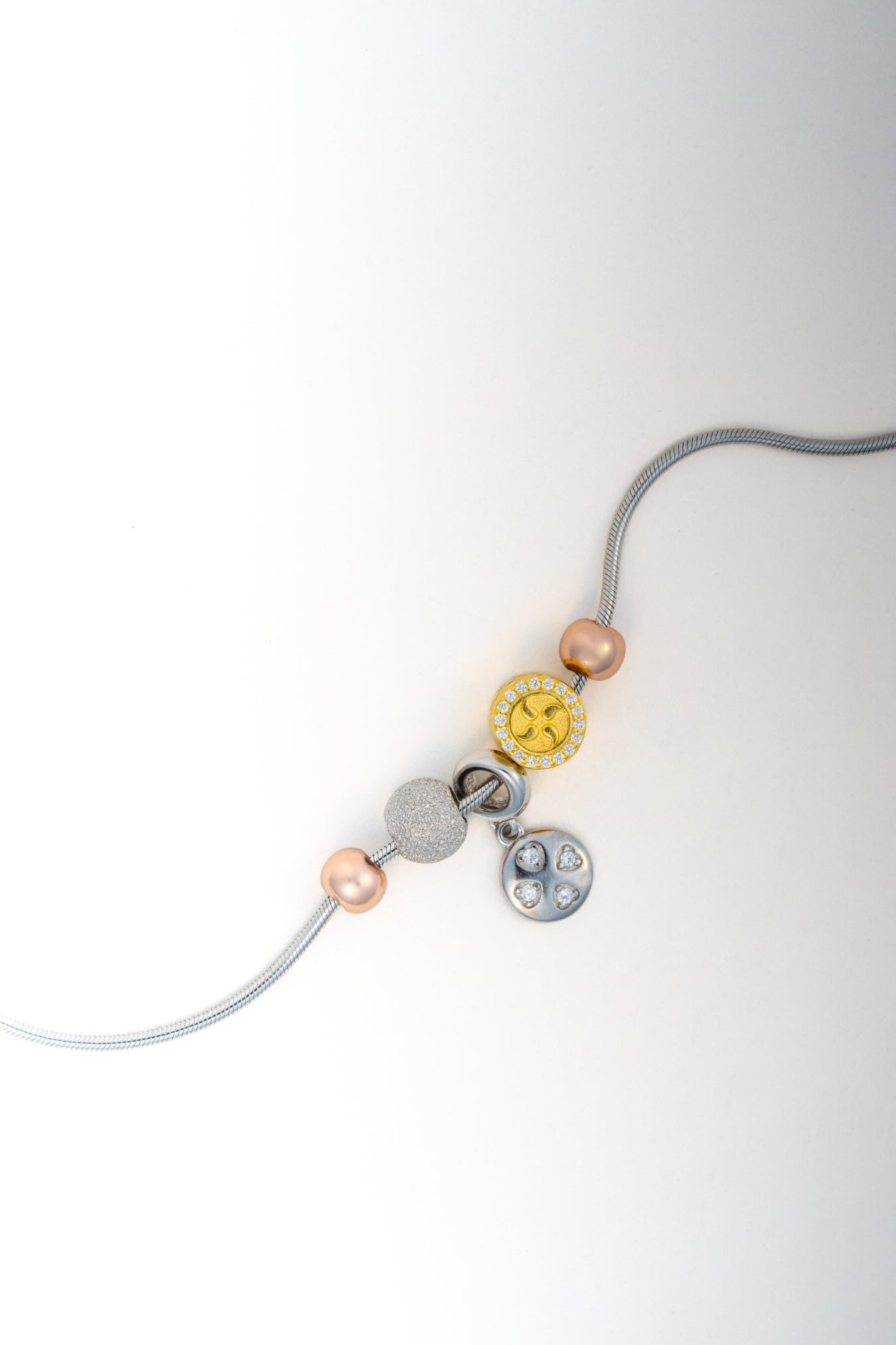 A playful yet elegant piece, this snake chain bracelet is designed with unique multi-tone beads and dangling charms for a modern chic look. Featuring shimmering silver, rose gold, and yellow accents, this bracelet is perfect for adding a touch of personality to any outfit. Its 7.5-inch length ensures a comfortable fit while the lobster clasp keeps it secure all day.